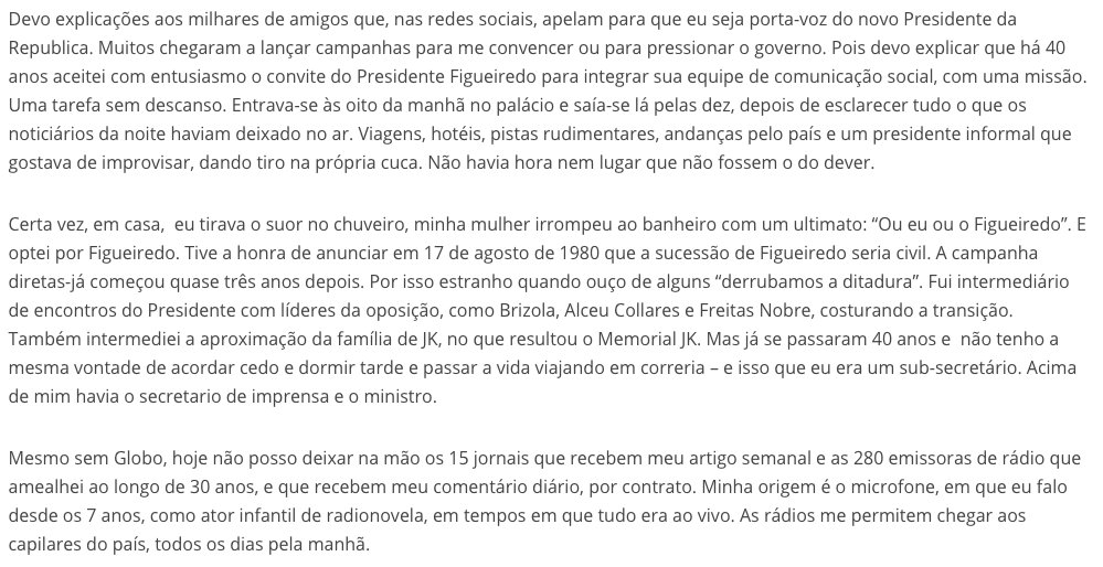 O jornalista foi apoiador público do novo presidente, mas deixou bem claro em um longo texto publicado no Twitter que não voltará a um cargo público que já ocupou durante a gestão de João Figueiredo, na ditadura militar.