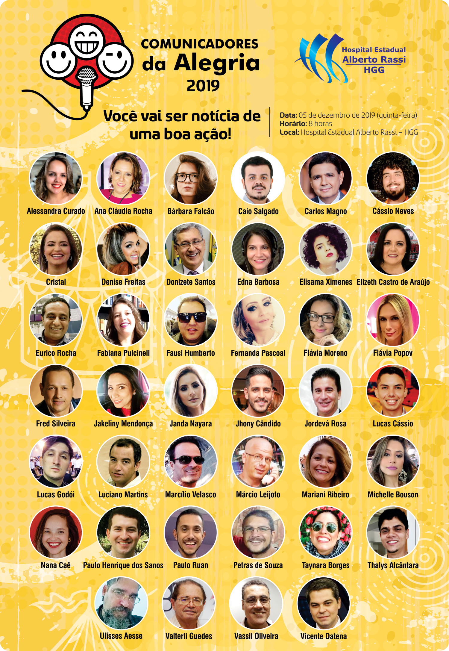 Nesta próxima quinta-feira, 5 de dezembro, mais de 40 jornalistas de diversos veículos de TV, rádio, impresso e portais de notícias da capital se reunirão no Hospital Estadual Alberto Rassi – HGG para alegrar dezenas de pacientes e acompanhantes internados na unidade. Esta será a 7ª edição dos Comunicadores da Alegria, que nasceu com o objetivo de apresentar a realidade do Sistema Único de Saúde (SUS) para os formadores de opinião do Estado e proporcionar momentos de emoção e divertimento aos pacientes, que, por vezes, se encontram em longo período de internação.