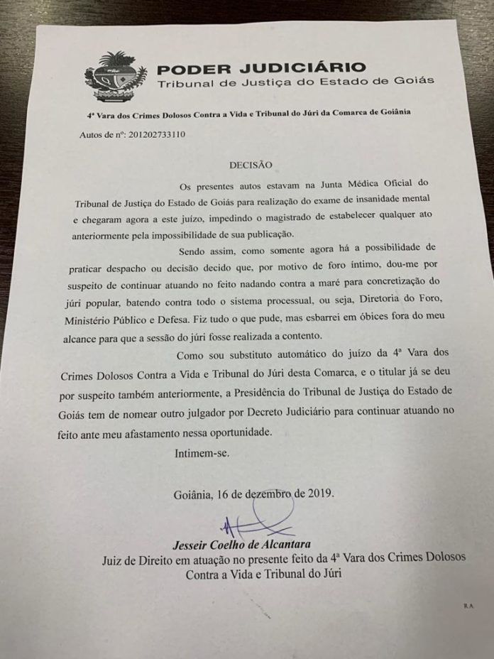 O juiz da 4 Vara dos Crimes Dolosos Contra a Vida, Jesseir Coelho de Alcântara, declarou a suspeição e deixará de presidir o processo envolvendo o caso da morte do radialista Valério Luiz. O magistrado, que em outubro passado marcou para 19 de fevereiro de 2020, a partir das 8h30, o julgamento do cabo da Polícia Militar Ademá Figueiredo, um dos acusados pelo crime, alegou motivo de foro íntimo.