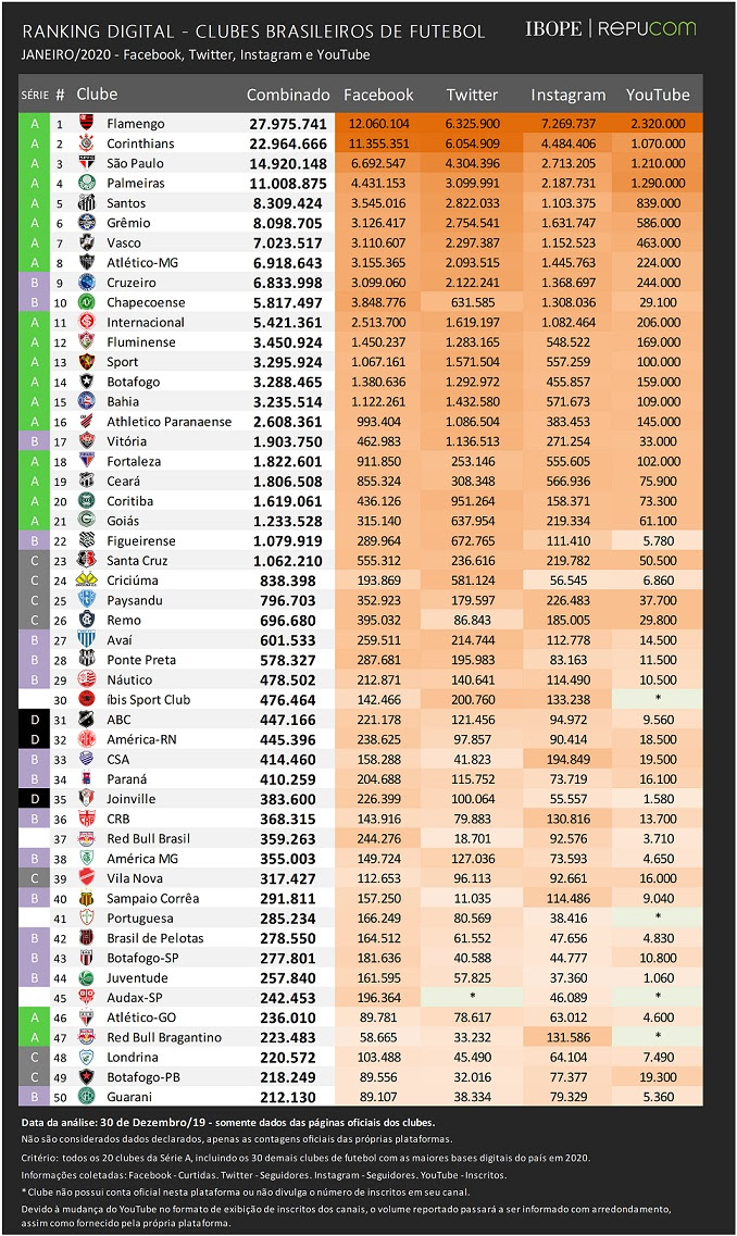 Ao longo de 2019, os 45 clubes monitorados somaram, juntos, 20 milhões de novas inscrições em suas redes sociais, 68% a mais que em 2018 (11,9 milhões). Do total de novas inscrições, 80% (16 milhões) se concentraram em apenas dez clubes: Flamengo (6,7 milhões), Corinthians (2 milhões), São Paulo (1,3 milhão), Palmeiras (1,1 milhão) e Atlético Mineiro (1 milhão), Grêmio (907 mil), Internacional (796 mil), Vasco da Gama (792 mil), Santos (682 mil) e Cruzeiro (644 mil).