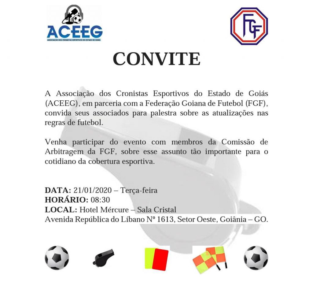 O evento será realizado sem custos para o profissional, em virtude de uma parceria da ACEEG com a Federação Goiana de Futebol e acontecerá durante um café da manhã, na Sala Cristal, no Hotel Mercure, em Goiânia, às 08h30 da manhã. Todos os cronistas esportivos que atuam em Goiás estão convidados. O Hotel Mercure fica na Av. República do Líbano, nº 1.613, Setor Oeste.