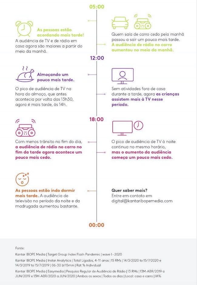 Outra novidade é a antecipação do pico de consumo vespertino. Antes da crise sanitária, a quantidade de televisores conectada subia significativamente no fim da tarde. Agora, com a rotina de home office e com estudantes em casa, o aumento da audiência ocorre mais cedo que o habitual.