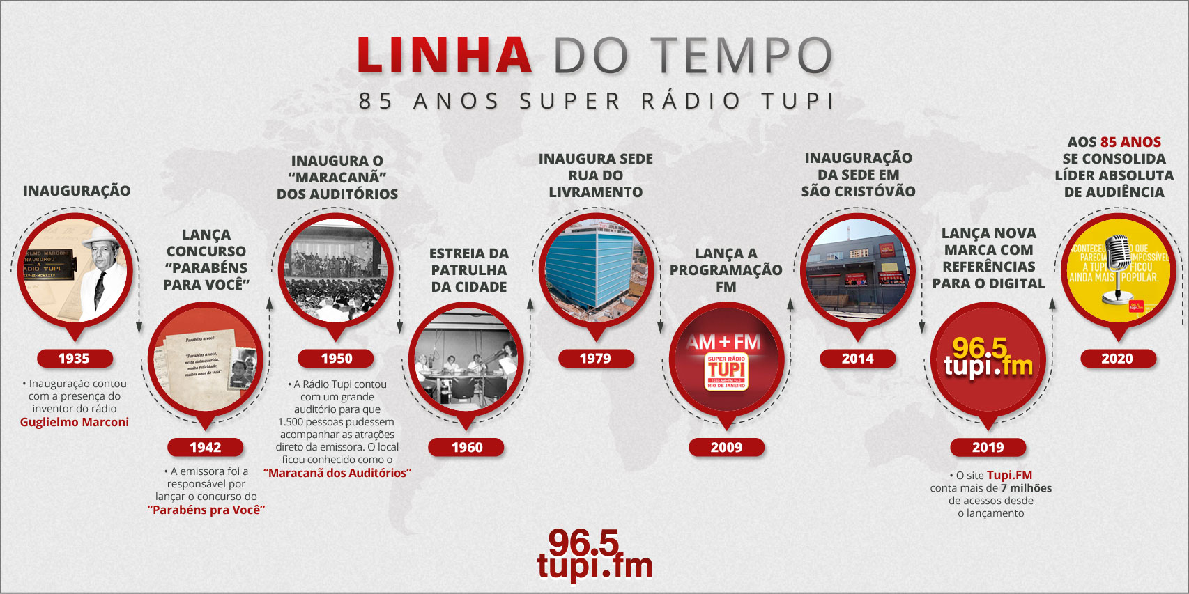 Há exatos 85 anos entrava no ar a rádio mais querida e tradicional de todo o Brasil, a Super Rádio Tupi. A emissora, com trajetória pioneira e que se mistura com a história do país, comemora mais um ano de operação com tradição no entretenimento, jornalismo e esporte. Conheça a história da rádio líder de audiência no Rio de Janeiro.