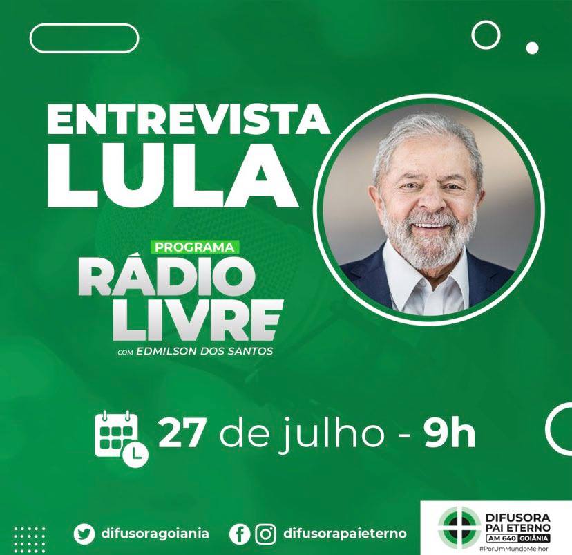 Em suas redes sociais, o ex-presidente Lula publicou que irá conceder entrevista à Rádio Difusora Pai Eterno 640 AM nesta terça-feira,27, ao vivo, às 9h05.