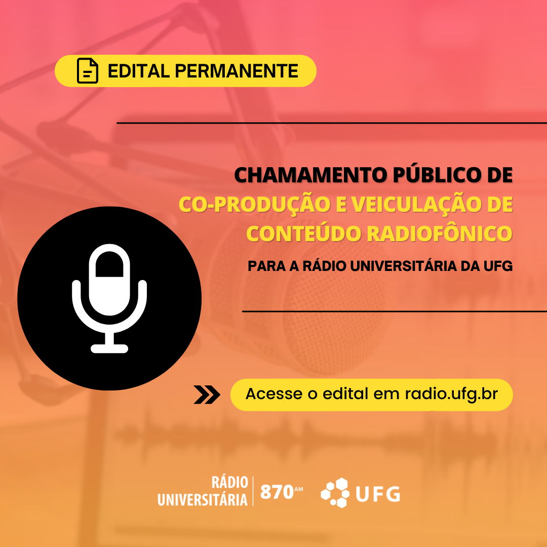 A Rádio Universitária da UFG publicou na última quinta-feira (2) edital permanente de chamamento público de co-produção e veiculação de conteúdo radiofônico (Edital 01/2021). O objetivo é selecionar propostas da comunidade interna, externa e mista da Universidade Federal de Goiás de programas radiofônicos em caráter voluntário e gratuito, co-produzidos ou veiculados na programação da emissora.