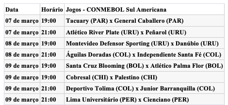 Finalizando a semana, no dia 9 de março, às 21 horas, uma disputa entre colombianos, o Deportivo Tolima pega o Junior Barranquilla, com narração de João Paulo Cappellanes e comentários de Jorge Nicola. No mesmo dia e horário, dois times peruanos entram em campo com a partida entre Lima Universitário contra Cienciano, com narração de Marcos Segatti e comentários de Marcos Bopp.