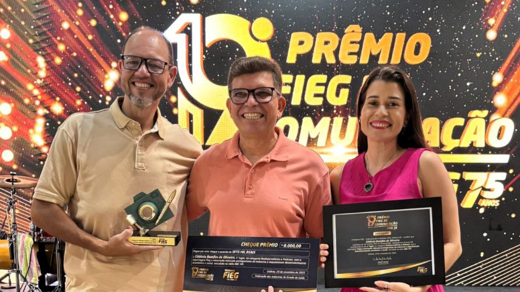 A equipe de radiojornalismo da RBC FM faturou mais um prêmio de comunicação. Desta vez foi na 19ª edição do Prêmio Fieg de Comunicação, da Federação das Indústrias do Estado de Goiás. A equipe formada por Gil Bomfim (repórter), Jeniffer Jacob (produtora) e Fausto Marciano (editor) ganhou em primeiro lugar na categoria Radiojornalismo e Podcast, com a reportagem “Fieg e mineração reforçam protagonismo da indústria e impulsionam desenvolvimento econômico e social”.