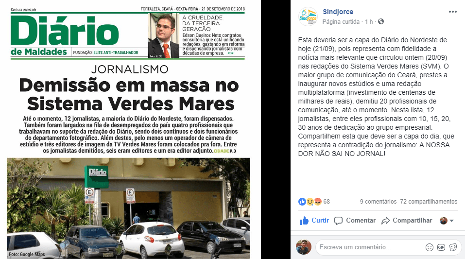 No mais, o sindicato também fez questão de repudiar a atitude tomada pela afiliada global ao realizar uma montagem na capa do jornal Diário do Nordeste, veículo pertencente ao Sistema Verdes Mares, nomeando-o como “Diário de Maldades”, com o título “Demissão em massa no Sistema Verdes Mares”, onde abaixo descreve quais os profissionais receberam as contas mais cedo. “A NOSSA DOR NÃO SAI NO JORNAL!”, criticou a página do Sindjorce na legenda da publicação.
