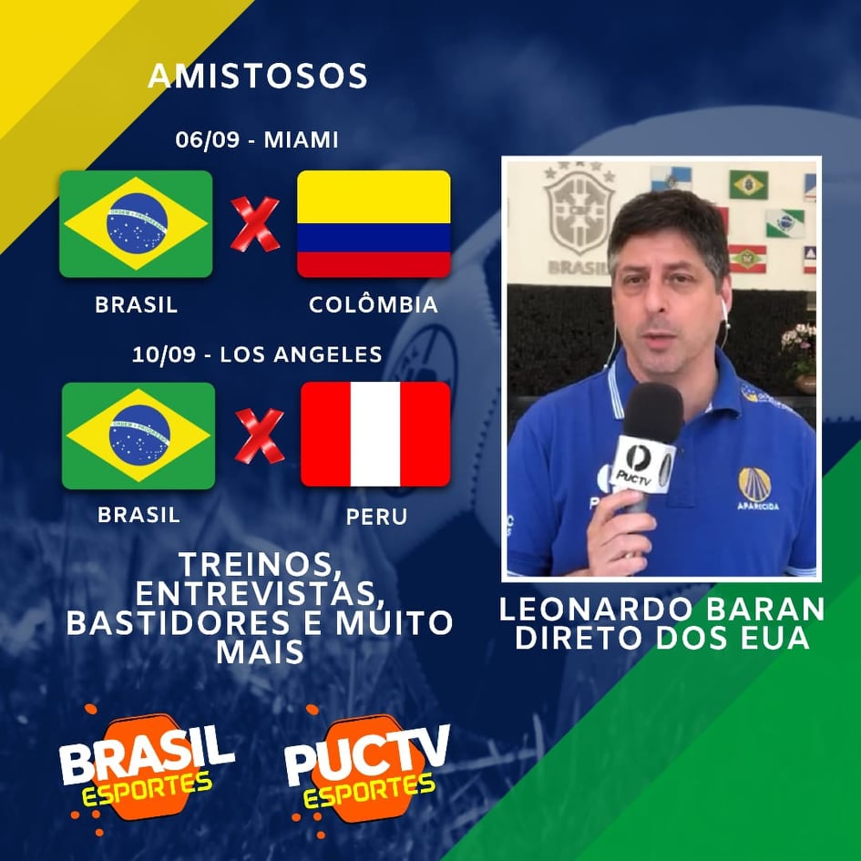 A equipe do PUC TV Esportes estará com um profissional na cobertura dos dois próximos jogos amistosos da Seleção Brasileira, nos Estados Unidos, neste mês de setembro. O repórter Leonardo Baran a partir deste domingo (01) estará cobrindo os treinos, entrevistas coletivas, zonas mistas e mostrando todos os detalhes das partidas.