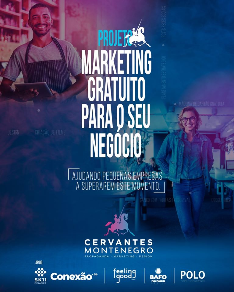 A agência de publicidade Cervantes Montenegro vai selecionar cinco empresas e oferecer, durante um mês, diversos serviços como: reformulação da marca, criação de identidade visual, estratégias para aumento de vendas, conteúdos para redes sociais, análise de mercado, máquina de cartão gratuita, e Google Ads. Tudo isso de maneira totalmente remota, e de graça, para ajudar os pequenos empreendedores neste momento de crise causada pelo coronavírus.