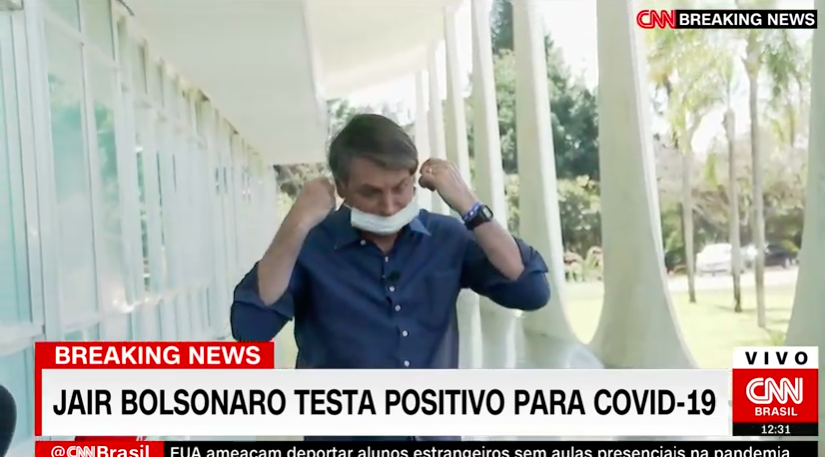 Infectado, o político quebrou o isolamento social e ainda tirou a máscara na frente dos repórteres, que seguravam o microfone na entrevista.
