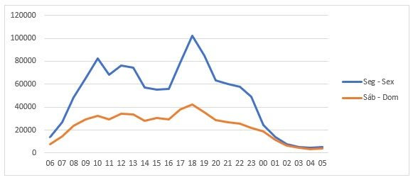 Comparando as interações entre dias de semana e fins de semana, ainda que parecidas, observamos um volume maior ao longo dos dias de semana. O pico de postagens acontece no final da tarde, entre 18 e 20 horas, faixa que concentra 20% dos tweets diários. Nos finais de semana, os tweets pela manhã possuem uma curva mais fluida entre os horários, enquanto durante a semana existe um pico matinal às 10 horas.
