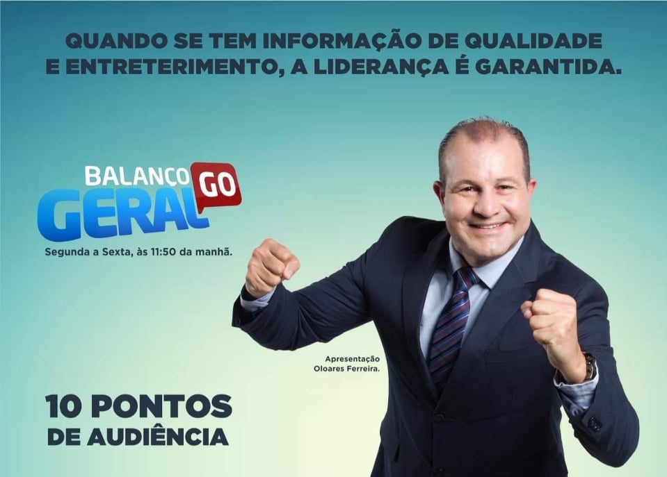 - O Balanço Geral GO garantiu o primeiro lugar com 10 pontos de média e share de 23%, contra 9,6 pontos de média da concorrente (TV Anhanguera/Globo). A apresentação é de Oloares Ferreira.