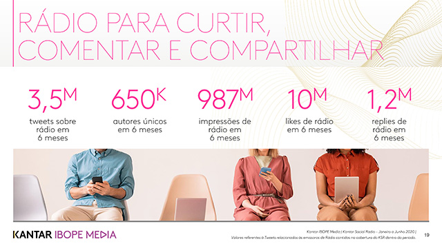Durante o isolamento provocado pela pandemia do novo coronavírus, 75% afirmaram que ouviram o meio com a mesma intensidade ou até mais. Já 17% disseram à Kantar que passaram a ouvir rádio muito mais após o isolamento, possibilitando presumir que a experiencia de consumir o rádio no auge da pandemia foi positiva para a audiência.