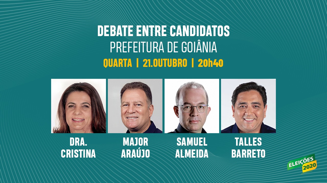 As emissoras da Agência Brasil Central, em parceria com a TV Alego, promovem nesta quarta-feira, 21, a partir das 20h40, o debate com o segundo grupo de candidatos a prefeito de Goiânia. Vão estar frente a frente, apresentando seus projetos e programas, os candidatos Major Araújo, Dra Cristina, Talles Barreto e Samuel Almeida. O mediador será o jornalista Paulo Beringhs.