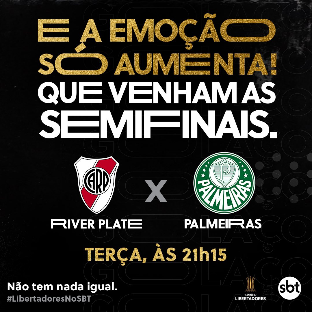 River Plate e Palmeiras se enfrentam nesta terça-feira (5), pela primeira partida das semifinais da Libertadores. A luta do Verdão pelo bicampeonato tem mais um capítulo a partir das 21h15, com exibição do SBT para todo o Brasil, na TV ou no sbt.com.br.