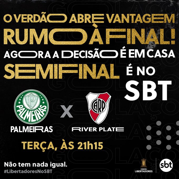 Na noite desta terça-feira (12), a Libertadores da América terá seu primeiro finalista. Depois da vitória do Verdão em Avellaneda, o Palmeiras recebe o River Plate a partir das 21h15, com transmissão do SBT para todo o Brasil, na TV e no site.