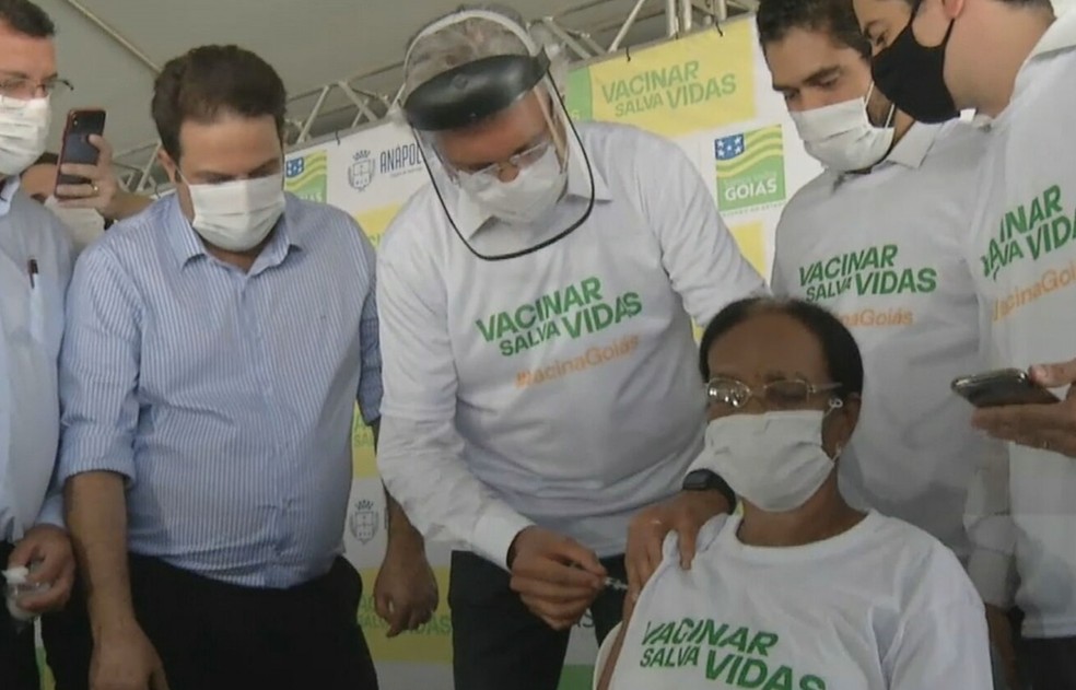Uma moradora de um abrigo de idosos é a primeira goiana a receber a vacina contra a Covid-19 no estado. A dose foi aplicada pelo próprio governador Ronaldo Caiado, que é médico, e aconteceu na tarde desta segunda-feira (18) na unidade de saúde do Residencial Leblon, em Anápolis, a 55 km de Goiânia. Maria Conceição da Silva, de 73 anos, tem seis filhos e trabalhou como doméstica e gari.