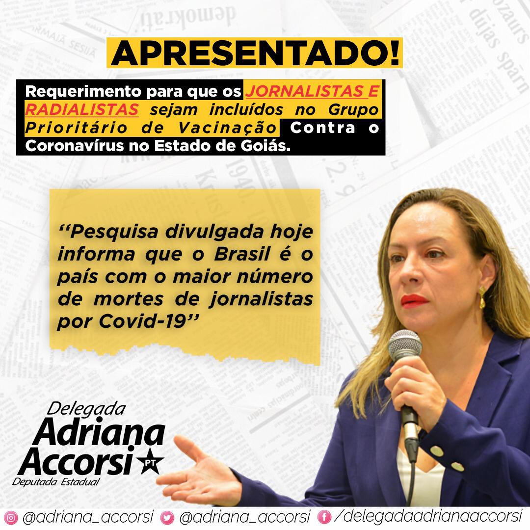 Na última terça-feira,6, a deputada estadual Adriana Accorsi (PT) protocolou requerimento junto ao Governo de Goiás solicitando que radialistas e jornalistas sejam incluídos no grupo prioritário de vacinação contra Covid-19. O documento foi encaminhado ao governador Ronaldo Caiado (DEM) e ao secretário estadual de Saúde, Ismael Alexandrino.
