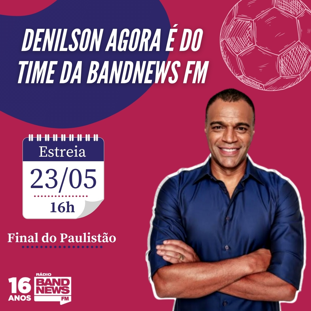 O pentacampeão mundial de futebol Denilson é a mais nova estrela do time da BandNews FM de São Paulo. Irreverente, alto-astral e, sobretudo, muito bem-informado, ele estreia no próximo domingo (23), a partir das 15h, como comentarista da rádio durante a final do Campeonato Paulista, que traz o duelo entre São Paulo e Palmeiras. “Estou muito ansioso. Não poderia existir um momento melhor para estrear na BandNews FM do que em uma final do Paulistão com dois times nos quais atuei e venci esse mesmo torneio por duas vezes: em 1998, pelo São Paulo, e em 2008, com o Palmeiras. É muito louco como a vida vai nos direcionando e dando as oportunidades na hora certa”, afirma.