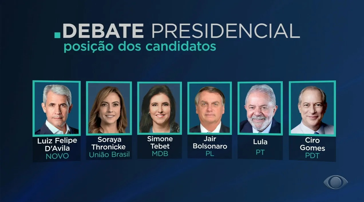 O evento, realizado no principal estúdio da Band em São Paulo, colocará frente a frente, pela primeira vez, os principais candidatos ao Planalto: Luiz Inácio Lula da Silva (PT), Jair Bolsonaro (PL), Ciro Gomes (PDT), Simone Tebet (PMDB), Felipe D’Avila (Novo) e Soraya Thronicke (União Brasil).