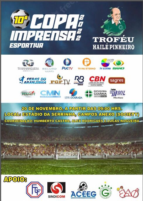 No próximo domingo,20, será realizada a 10ª edição da Copa Imprensa de Futebol. As partidas serão realizadas nos campos anexos do Estádio da Serrinha, em Goiânia, a partir das 9h.