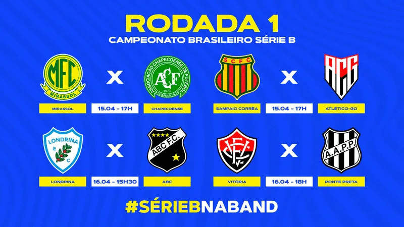 No domingo (16), a Band estreia as transmissões nacionais com rodada dupla. Às 15h30, Londrina e ABC se enfrentam no Estádio do Café, no Paraná. Já às 18h, é a vez de Vitória e Ponte Preta duelarem no Barradão, em Salvador.