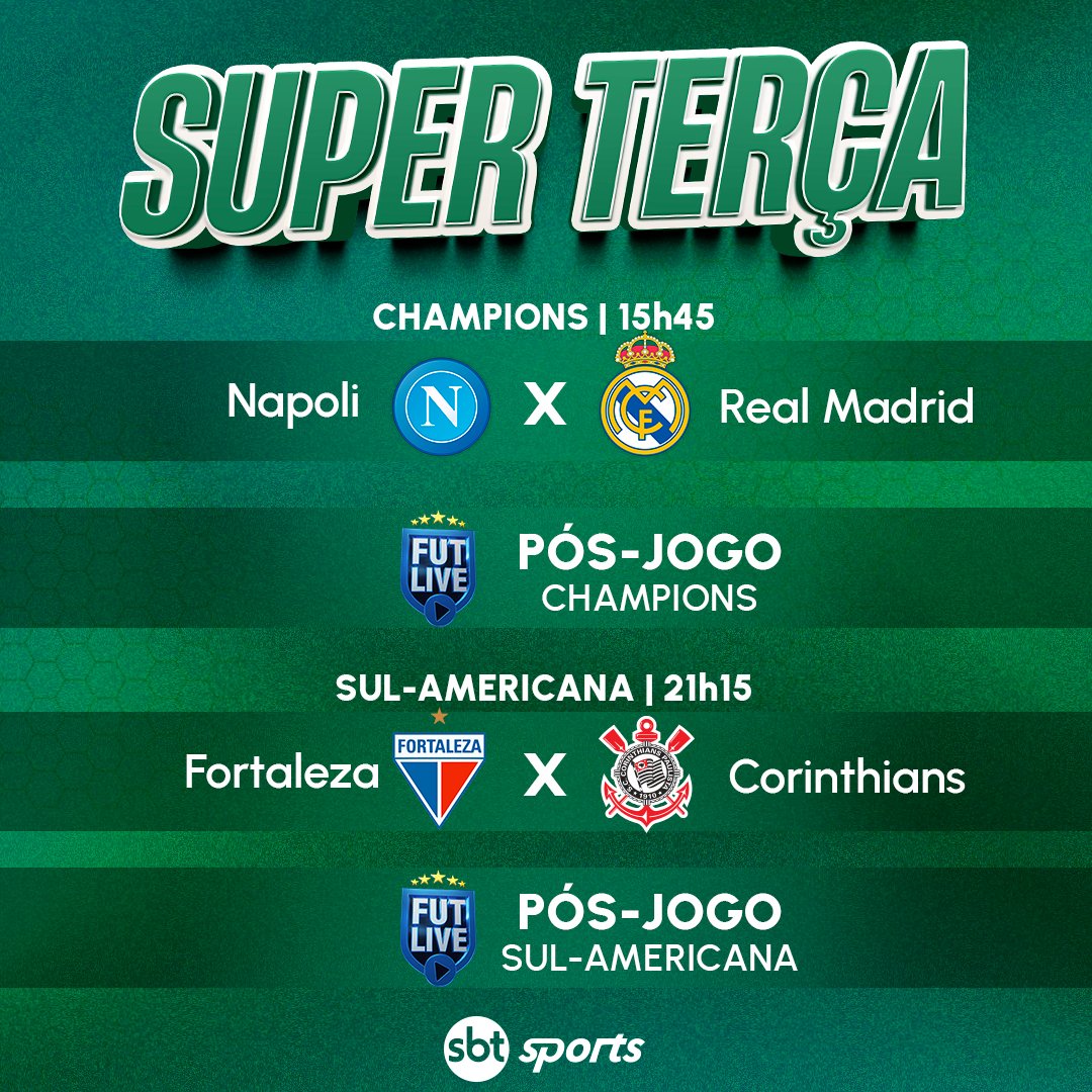 Às 15h45 (de Brasília), tem Napoli x Real Madrid, pela fase de grupos da UEFA Champions League. Mais tarde, às 21h15, acontece o duelo entre Fortaleza e Corinthians, dois gigantes em busca de uma vaga na grande final da Conmebol Sul-Americana.
