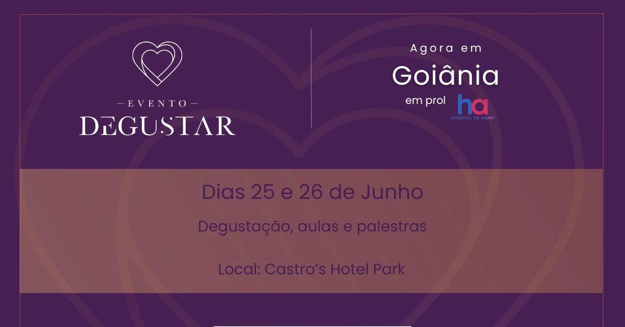 O 21º Evento Degustar acontece entre os dias 25 e 26 de junho de 2024 e pela primeira vez escolheu Goiânia para o grande encontro entre profissionais de eventos, como gastronomia e decoração, em prol do Hospital de Amor. A escolha do local tem um propósito importante, já que os recursos arrecadados nesta edição serão destinados para a construção do Lar dos Artistas do Amor na cidade para acomodar gratuitamente pacientes e seus familiares vindos de outras regiões para o tratamento do câncer.