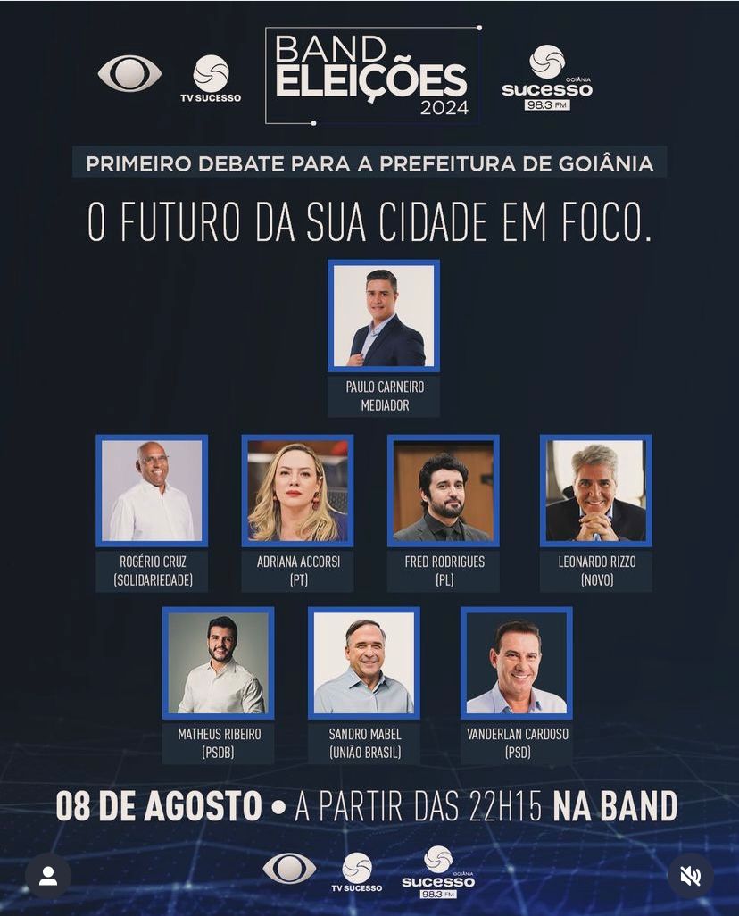 A TV Sucesso Band, canal 17.1 em Goiânia e a Rádio Sucesso 98.3 FM, realizam o primeiro debate político com os pré-candidatos a prefeito de Goiânia, no dia 8 de agosto (quinta-feira), às 22h15. O evento será transmitido ao vivo diretamente da sede da emissora na capital goiana para todo o Estado de Goiás. O jornalista e apresentador Paulo Carneiro será o mediador do debate.