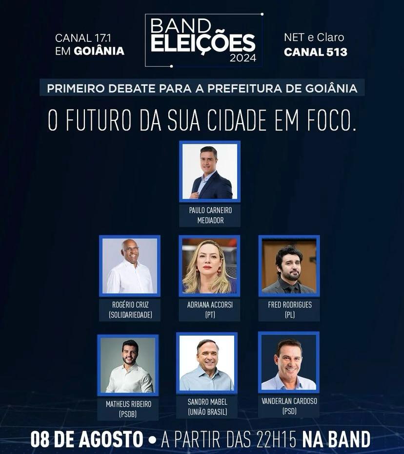 A TV Sucesso Band, canal 17.1 em Goiânia e a Rádio Sucesso 98.3 FM, realizam o primeiro debate político com seis pré-candidatos a prefeito de Goiânia, no dia 8 de agosto (quinta-feira), às 22h15. Os pré-candidatos confirmados são: Rogério Cruz, Adriana Acorsi, Fred Rodrigues, Matheus Ribeiro, Sandro Mabel e Vanderlan Cardoso.