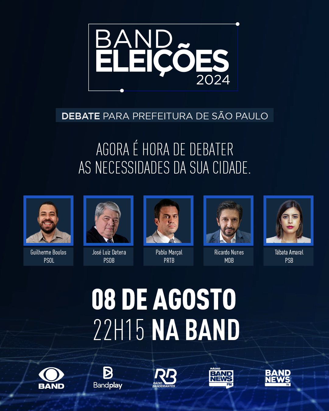 A Band mantém a tradição de abrir o calendário eleitoral e realiza os primeiros debates entre os candidatos às prefeituras nesta quinta-feira (8), às 22h15. Além de São Paulo, 18 municípios irão promover os confrontos na mesma data, entre eles, as capitais Belo Horizonte, Boa Vista, Curitiba, Fortaleza, Goiânia, João Pessoa, Manaus, Natal, Porto Alegre, Rio de Janeiro, Salvador e Teresina. Todos os encontros serão transmitidos simultaneamente nas plataformas digitais Band.com.br e Bandplay. Em outras 32 cidades, os embates vão ocorrer entre os dias 14 de agosto e 2 de outubro.
