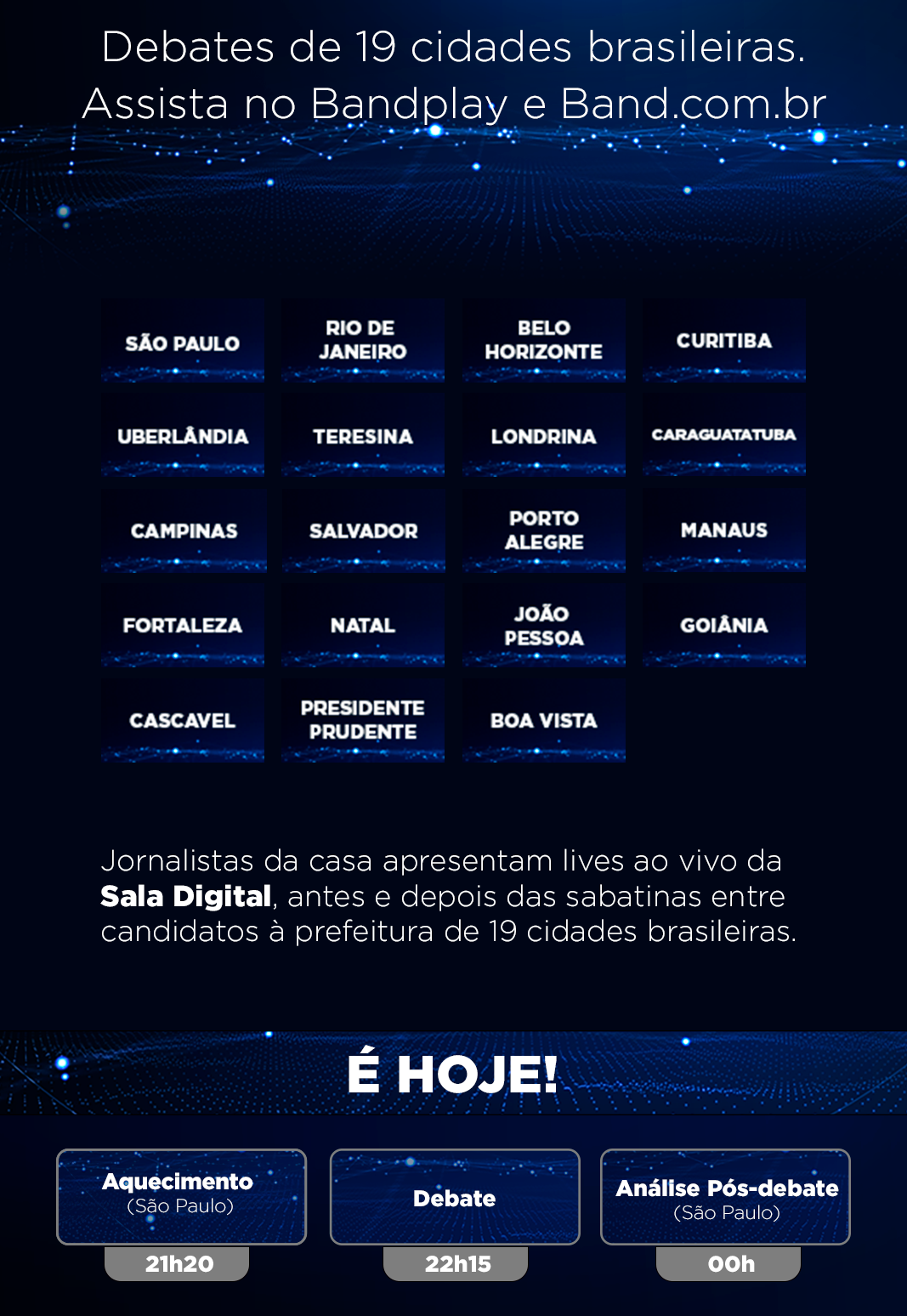 O Grupo Bandeirantes promove nesta quinta-feira, a partir das 22h15, os primeiros debates entre os candidatos a prefeito em 19 municípios. O aquecimento começa às 21h20, quando jornalistas da emissora se reúnem para mostrar uma prévia das sabatinas. A transmissão vai ao ar pelo site Band.com.br, pelo aplicativo Bandplay e pelo canal Band Jornalismo no YouTube com a participação de Lenny Leone, âncora da BandNews TV, Thaís Dias, apresentadora da Band, e Marco Túlio Pires, líder do Google News Lab no Brasil.