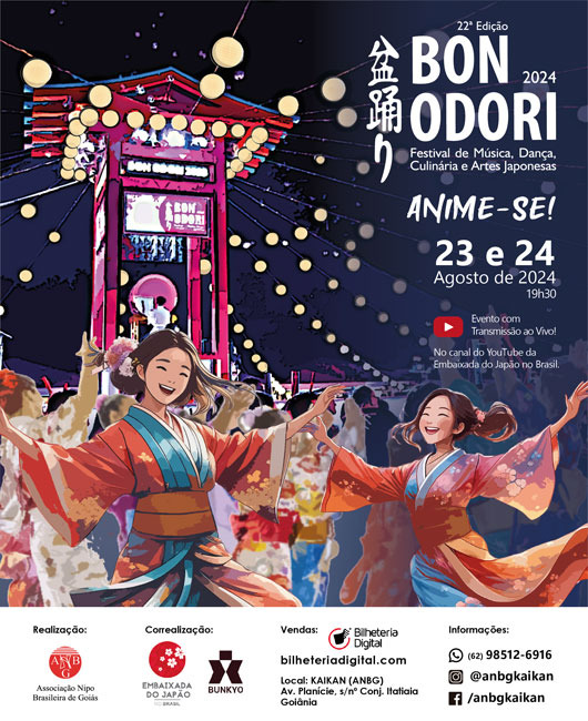 A abertura do Bon Odori, da comunidade japonesa em Goiânia, à participação da população em geral completa 22 anos em 2024. Internamente, a cerimônia ocorria desde os primórdios da instalação da comunidade da cidade, no final da década de 40. Consolidado no calendário festivo oficial da capital e do Estado, o festival animará o Clube Kaikan nos dias 23 (sexta, com ingressos já esgotados) e no 24 (sábado) de Agosto, a partir das 19h.