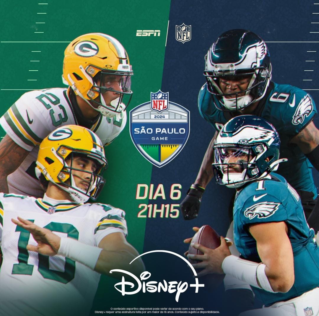 O principal destaque do início do calendário será a partida entre Philadelphia Eagles e Green Bay Packers, que acontecerá na Neo Química Arena nesta sexta-feira (6), às 21h15. O evento marcará a maior cobertura da história da ESPN no Brasil para uma partida de futebol americano e terá transmissão in loco da ESPN 2 e Disney+ com narração de Fernando Nardini e comentários de Paulo Antunes e Guilherme Cohen.