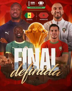 A Band transmite com exclusividade na TV aberta a grande final da Copa Africana de Nações neste domingo (18), às 15h30. O resultado da 35ª edição do principal campeonato do continente será definido em um duelo entre Senegal e Marrocos pelo título, no estádio Príncipe Moulay Abdellah, em Rabat, com narração de Sergio Mauricio e comentários de Julio Gomes e Andrey Mattos.