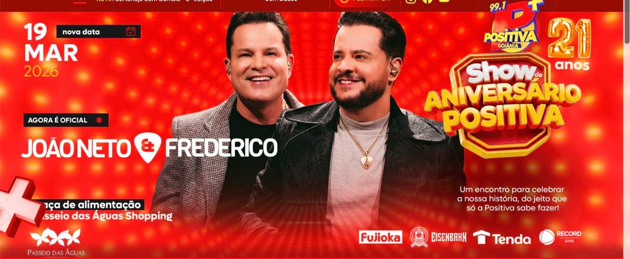 Positiva FM celebra 21 anos com show de João Neto & Frederico no Passeio das Águas Shopping